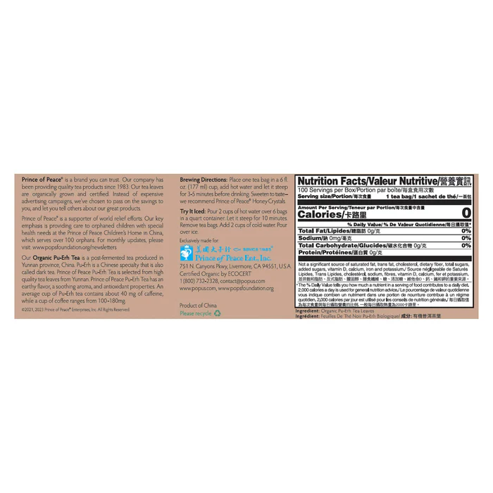 Organic Pu-Erh Tea – by Prince of Peace is a post-fermented tea produced in Yunnan province, China. Pu-Erh is a Chinese specialty that is also called dark tea. Prince of Peace Pu-Erh Tea is selected from high-quality tea leaves from Yunnan. Prince of Peace Pu-Erh Tea has an earthy flavor, a soothing aroma, and antioxidant properties. An average cup of Pu-Erh tea contains about 40mg of caffeine, while a cup of coffee ranges from 100-180mg.